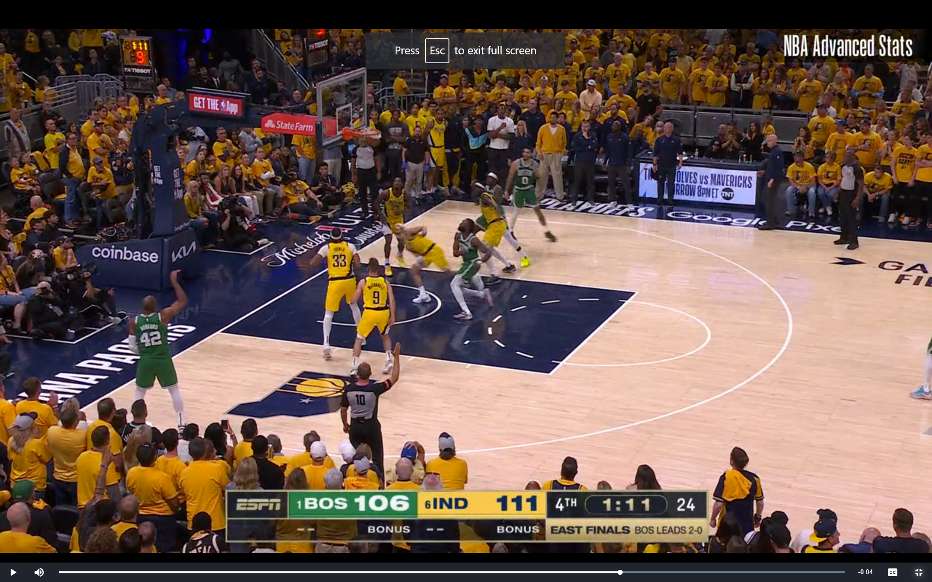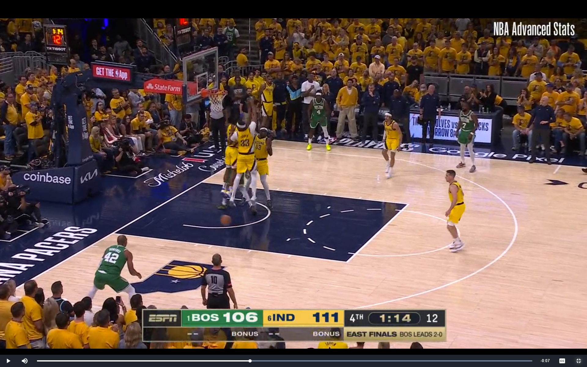 Up to that point in the game, Indiana was 5-for-21 on three pointers. Andrew Nembhard hit four of them, with the lone other coming when the C's dared TJ McConnell to take one. In a situation where you needed a three pointer, it's pretty clear that Nembhard should have been the one shooting. Except Carlisle seems pretty locked in to the notion of Nembhard triggering the inbounds pass. I'm not sure why, especially since he had already made a critical mistake in a similar situation in Game 1, and then also because the pass in this case was easy. Nembhard actually underhanded it to Nesmith!