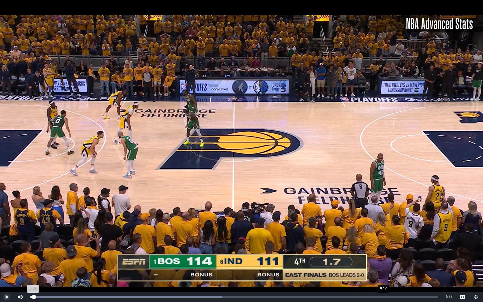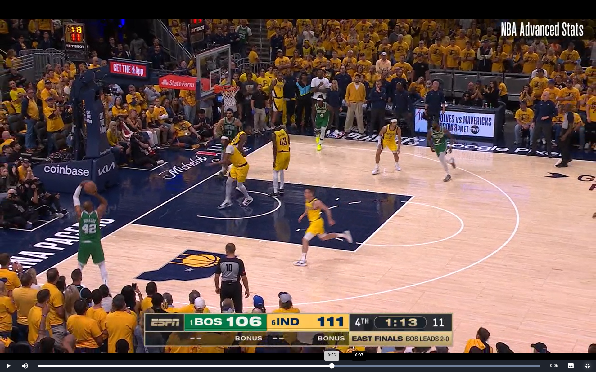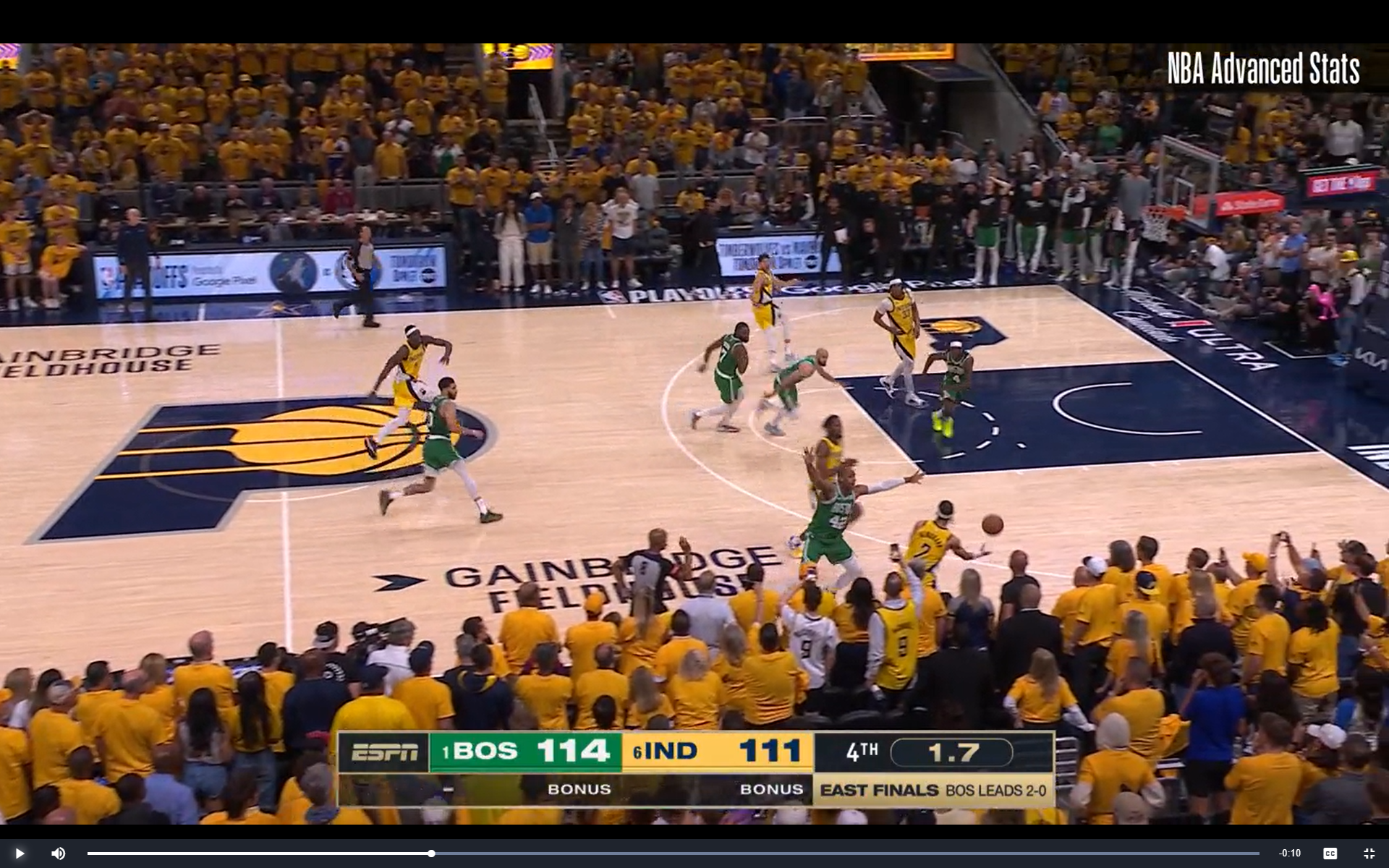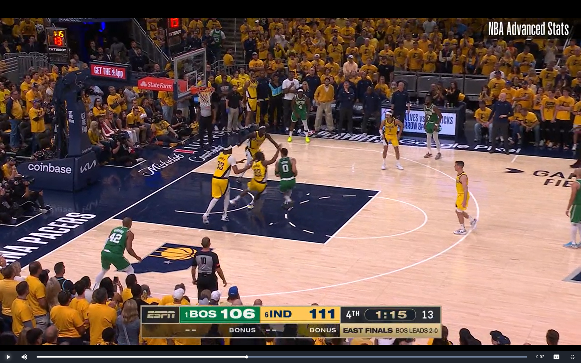 Instead of taking doors one or two, Tatum made a superstar play, and whipped that behind-the-back pass to Horford. If he tries that again tonight in Game 4, Indiana is probably ready for it. But on this night, they were helpless to watch like the rest of us. Let's look at another still-frame from right after Tatum throws the pass: