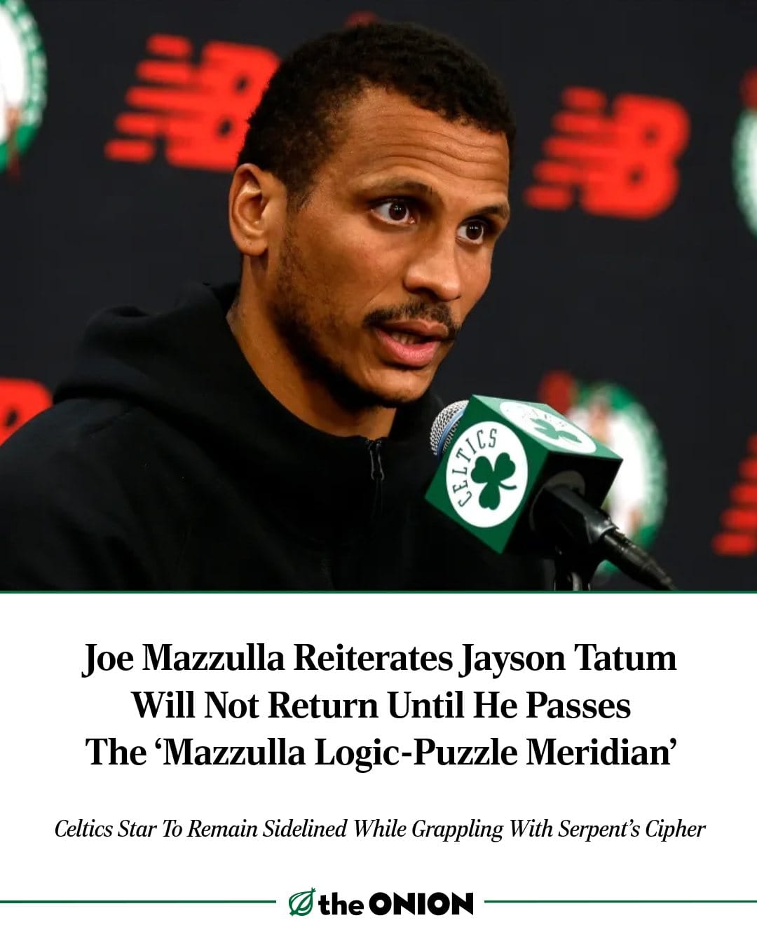 N/A. Jayson Tatum (N/A): It's funny because it's true. I wouldn't be even remotely surprised if coach Joe Mazzulla said something like "he’s putting in the work. But until he can distinguish the Staircase of Truth from the Staircase of Deception in under 40 seconds, there’s really nothing new to report."