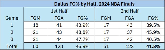 Just as important though, was how the C's turned off the Mavericks offense in the second half. In the regular season, Dallas posted a .481 field goal percentage. In the first round against the Clippers, Dallas shot .465 from the field. They shot .454 in the second round against Oklahoma City, and an even .500 in the Western Conference Finals against Minnesota. Through these three games, Dallas is shooting .444 – the worst they have all season. But the breakdown is even more stark: