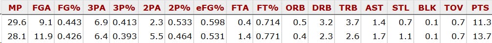 Trent's signing was lauded as a huge bargain, and that's nice and all, but once the games start, it won't matter so much. I want you to look at these two stat lines from last season and tell me which one is Beasley's and which one is Trent's: