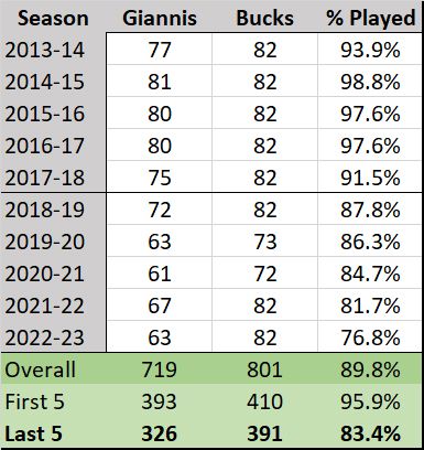 The first thing that intrigues me about Giannis this season is exactly how much he will play. After playing in at least 93% of Milwaukee's games in his first four seasons, his games played percentage has steadily dropped in each of the past six seasons: