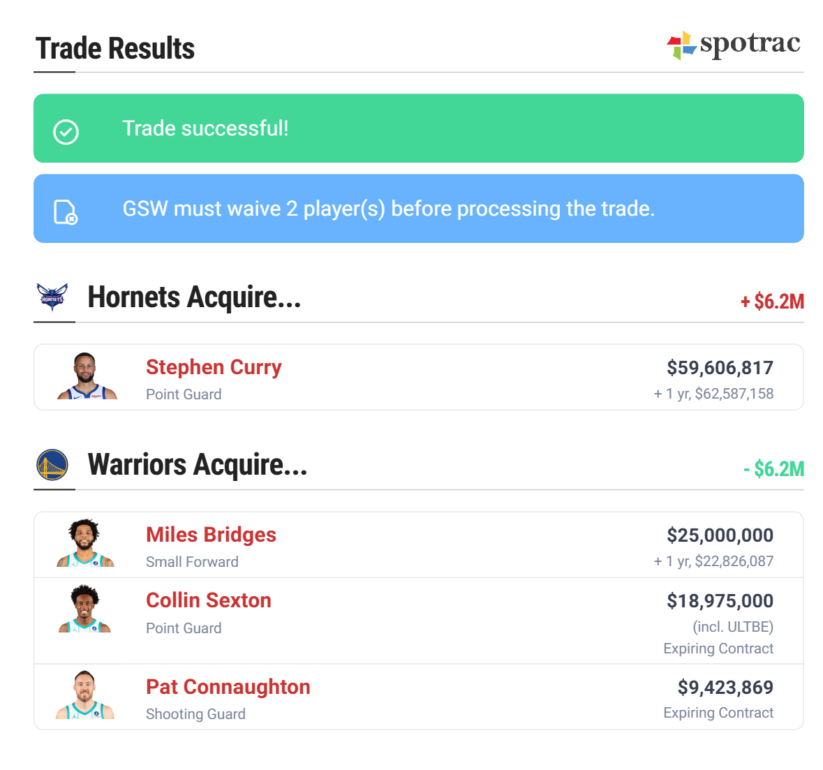 For Charlotte, this essentially swaps out Bridges for Curry. It is truly essential that the Hornets get off of Bridges (rumor has it they feel the same way). Not only is he an awful human being, but he has the same big brother-little brother thing going with the three young guns that Marcus Smart had with the Jay's here in Boston. I've watched my fair share of Hornets games this season, and toward the end of games, Bridges is still taken to believing that it's Miles Bridges Time. It's not an unfair belief – Bridges is now third on the Hornets' all-time scoring list behind only Kemba Walker and Dell Curry – but Bridges forces a lot of these winning time shots, and while that may have been fine when the team was awful and had no better options, that is no longer the case.