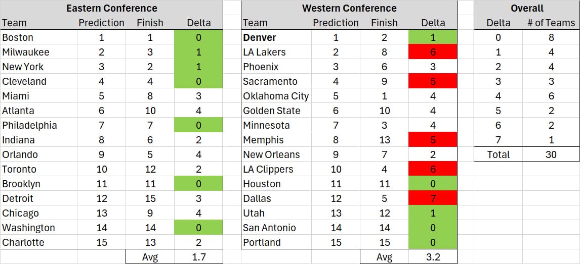 I did pretty good, I think, especially with the Eastern Conference. The West was so crowded that it made seeding screwy – Sacramento was in the top six just a couple of weeks ago – and I don't think that Memphis' glut of injuries were all that predictable. I was really, really off on the two LA teams, and the Mavericks. I feel like the Lakers prediction was somewhat on point – they've been 23-10 since the beginning of February. But I was way off on the Clippers and Mavs. Part of that is my bias – I have not cared for either team much in the past. Part of it is also because of the in-season trades both teams made, but their motivations to make trades were certainly there at the outset, so I could perhaps have accounted for them. But all in all, pretty satisfied with how I did!