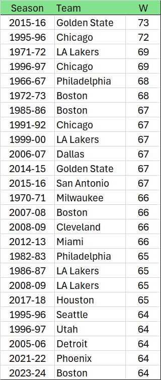 A little context here – NBA seasons were not always 82 games. The first such season was 1967-1968. In other words, knock out the first 18 NBA seasons. There have been 57 seasons since, and we need to take out another four – two due to lockouts, and two due to COVID – to get down to the 53 seasons with 82 games. In those 53 seasons, there have been 1,345 team seasons, making those 25 teams just 1.9% of the total seasons.