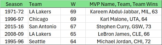 I could do a lot of complaining about this – I honestly think the media just doesn't like him that much because he always measures his words and actions, and very rarely says anything even remotely controversial or provocative – but at this point, it seems futile, so I thought I’d do something more productive. I looked at the historical precedents of such a great team not winning the MVP award. As such, let’s look at those 25 teams to win at least 64 teams: