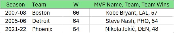That leaves just three teams who won at least 64 games and whose best player didn’t win MVP:
