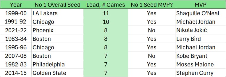 So, OK, let’s look at things from one other angle. What about teams with big leads? The C's finished seven games ahead of every other team in the NBA this season. Since the ABA merged with the NBA in time for the 1976-1977 season, there have been just eight other seasons in which the No. 1 overall seed has been at least seven games better than everyone else in the league. Six of those eight teams have had the league MVP on their team: