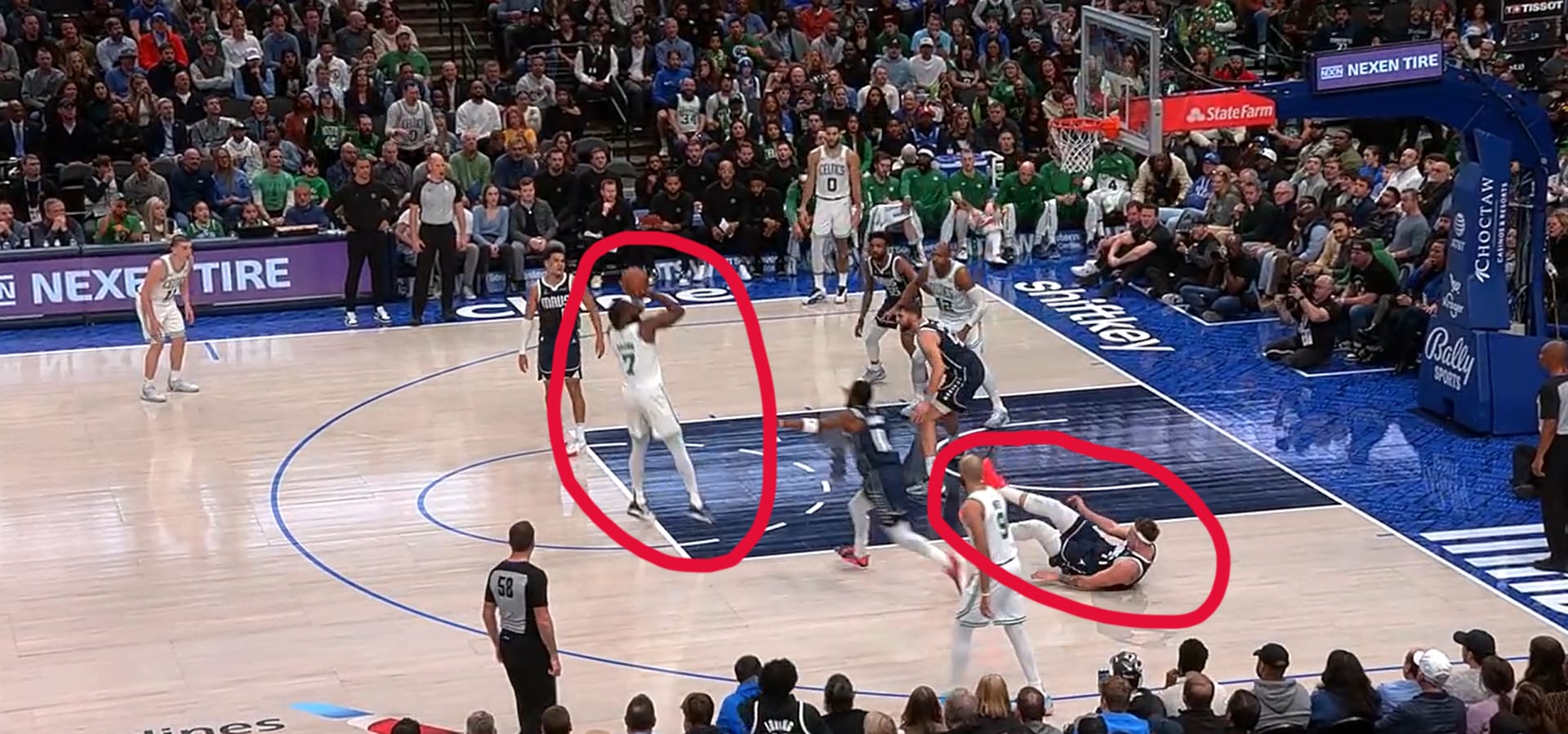 Jaylen Brown crossed over Luka so bad last night that Luka ended up a good 10 feet away from Jaylen when he went to shoot it. Let's take a look at the still frame: