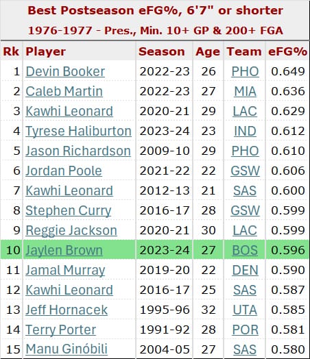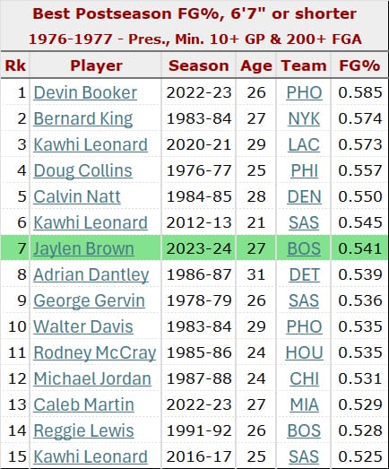 Pretty good company. That Bernard King postseason was referenced ad nauseum in the first two rounds when Jalen Brunson was going off. But, hey, maybe FG% isn't your thing, you want to look at eFG%. That incorporates the important difference that a three-point shot is worth more than a two-point shot. OK. Jaylen ranks 10th by that metric: