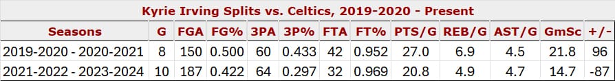 Since then? Irving hasn't been anywhere close to as much of a problem. He shot below 50% in eight of the 10 games, and he hit more than three three's in just one of those games. More importantly, his team – eight with Brooklyn and two with Dallas – was 0-10 in those 10 games. In his five most recent games played against Boston, he was -16, -11, -31, 0, and -15 in terms of +/-. Once the Jay's grew into lead players and the C's got Derrick White (and now Jrue Holiday), Irving just hasn't been a difference maker against Boston.