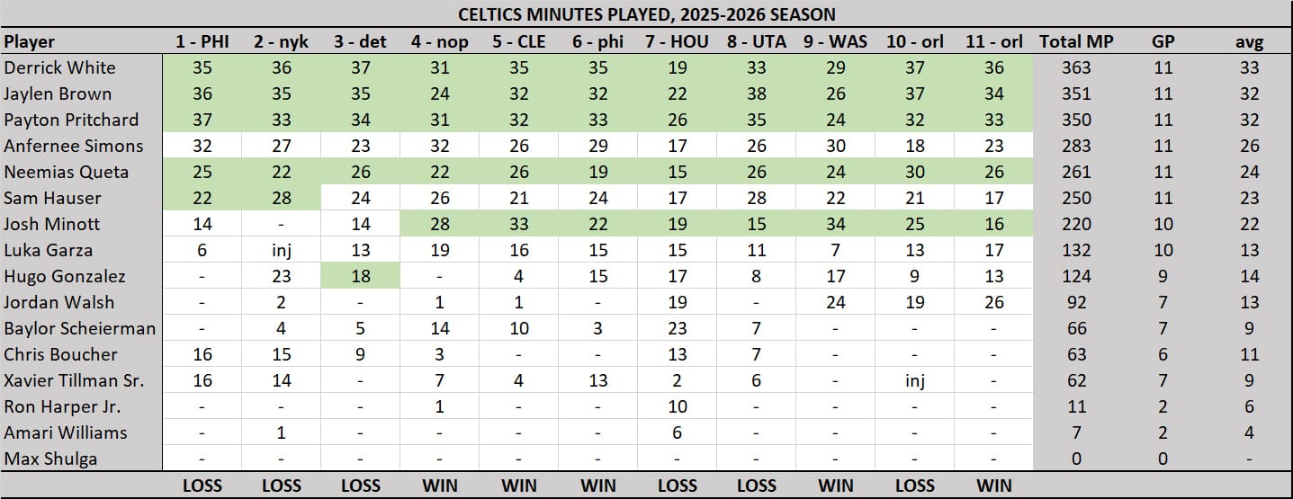 Big picture, it looks like the C's have settled on a 10-man rotation, with Derrick White, Payton Pritchard, Jaylen Brown, Josh Minott, and Neemia Queta as the starters, Anfernee Simons as the sixth man, and Sam Hauser, Luka Garza, Jordan Walsh, and Hugo González coming off the bench, in roughly that order. González sometimes doesn't play until the beginning of the second quarter. It's a solid 10-man rotation. I'm sure Baylor Scheierman, Chris Boucher, and Xavier Tillman Sr. will get opportunities to play in the future, but for now, it seems they're on the outside. Tillman, in particular, was awful in the Utah game, but none of the three have played since what was by far the most embarrassing loss of the season.