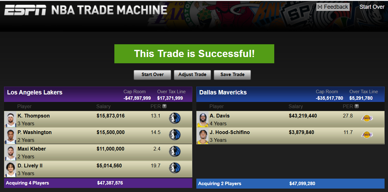 Even if I accept all of that, which I don't, as I pointed out a few weeks ago, the Mavericks had the ammunition to acquire Davis without trading Luka or Kyrie Irving. I even saved the deal I made in the Trade Machine: