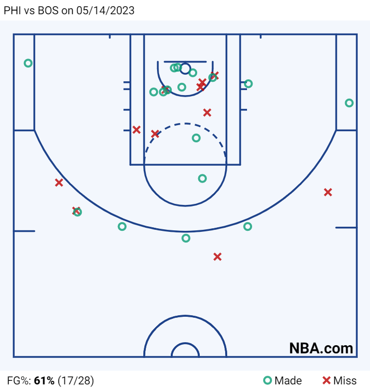 Those two green circles on either side of the free throw line, and that one by the right hashmarks – and even those three red x's in the paint but not right at the cup – showed Tatum's willingness to mix it up just enough to keep the Sixers guessing today. And guessing they were. Tatum did whatever he wanted to all game.
