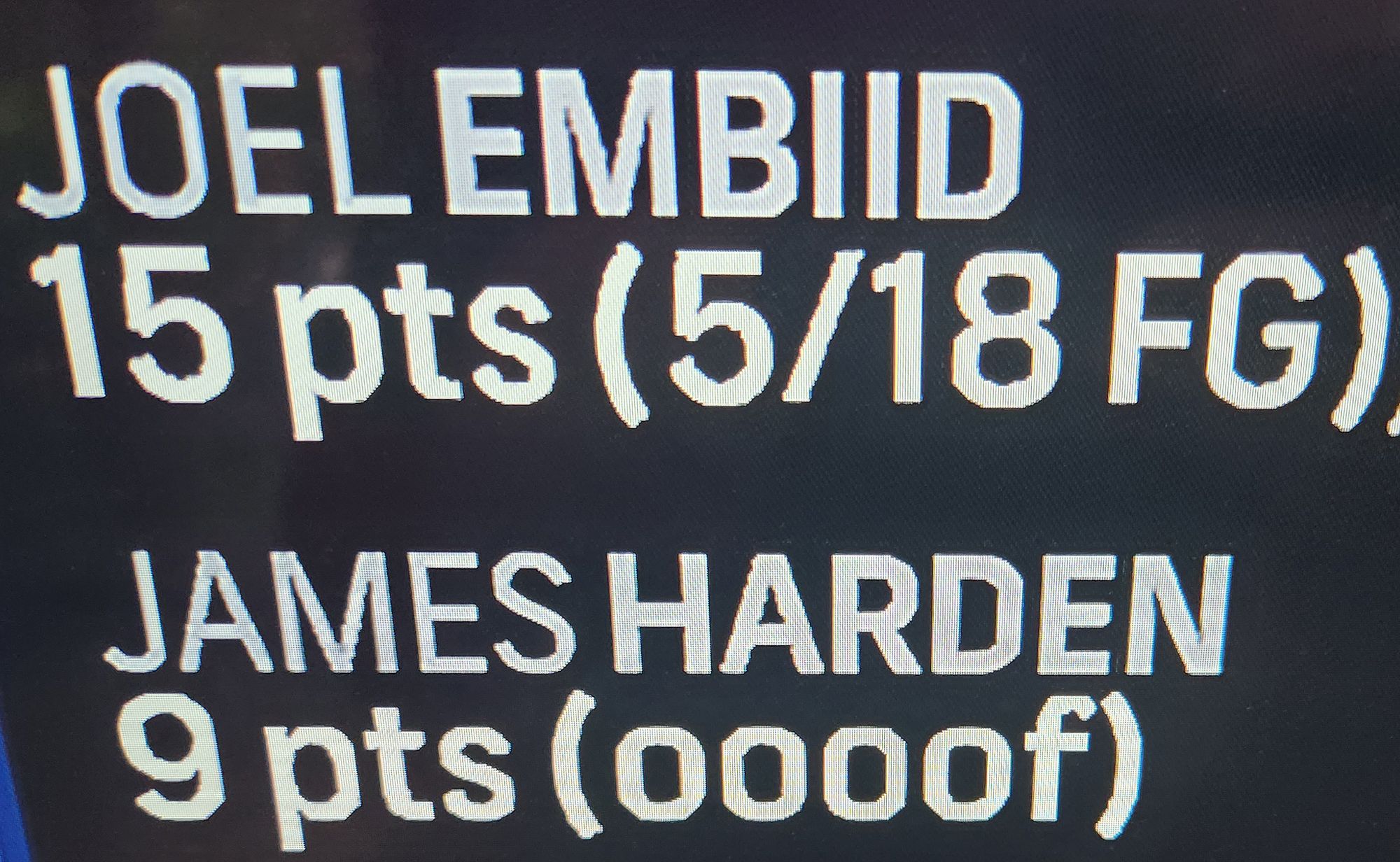 In the second half of Game 6, James Harden shot 1-for-6. Tonight, it was Joel Embiid's turn to shoot 1-for-6 in the second half. Overall, the pair each shot .404 in the second half in this series. Combined, they shot 40-f0r-99 in the second half of these seven games. These series are a best of seven because it's hard to win four straight games. Sometimes, guys have off nights. But you can't have this many.