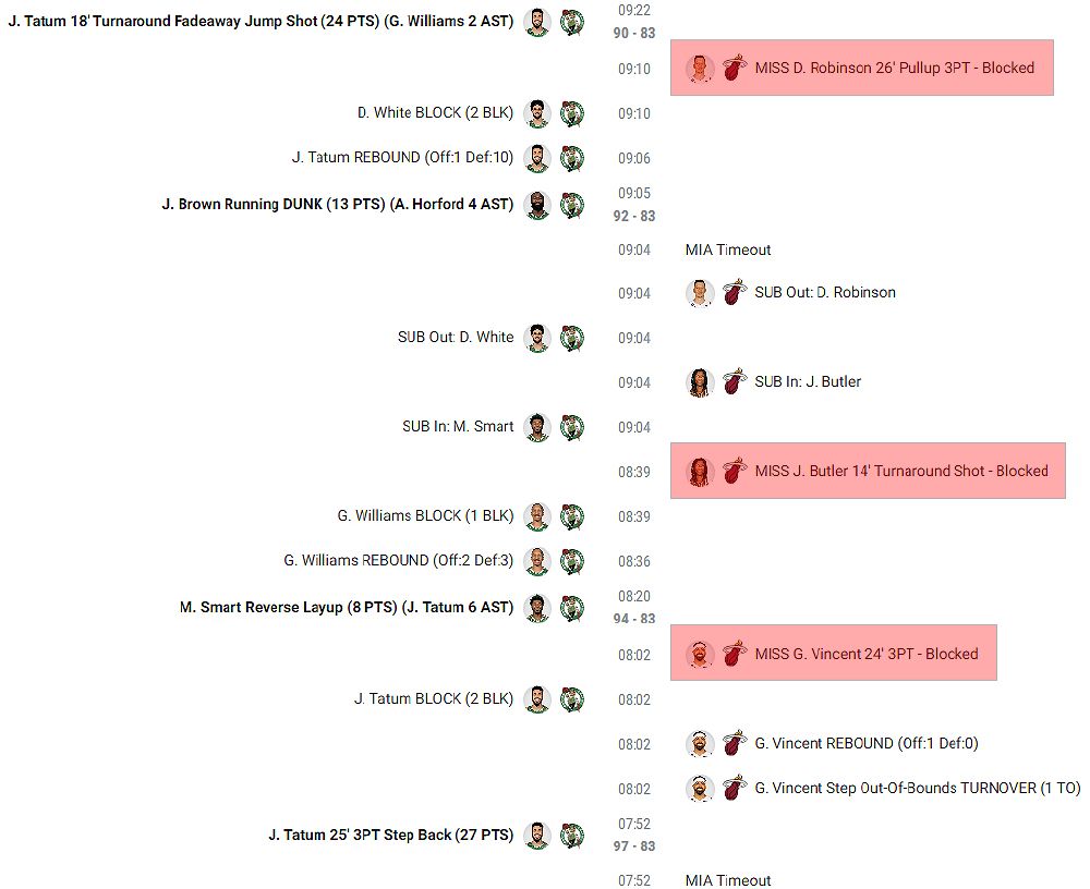 Rewind to the first block. If Robinson gets that shot off clean and hits it, it would have been a four-point game with just over nine minutes to play. Instead, ~78 seconds later, the C's had a 14-point lead, and the game was basically over, as log as the C's didn't collapse. The Heat briefly got the lead down to 13 points, but there was no furious comeback in them.