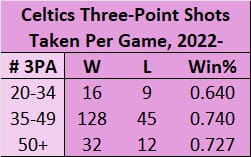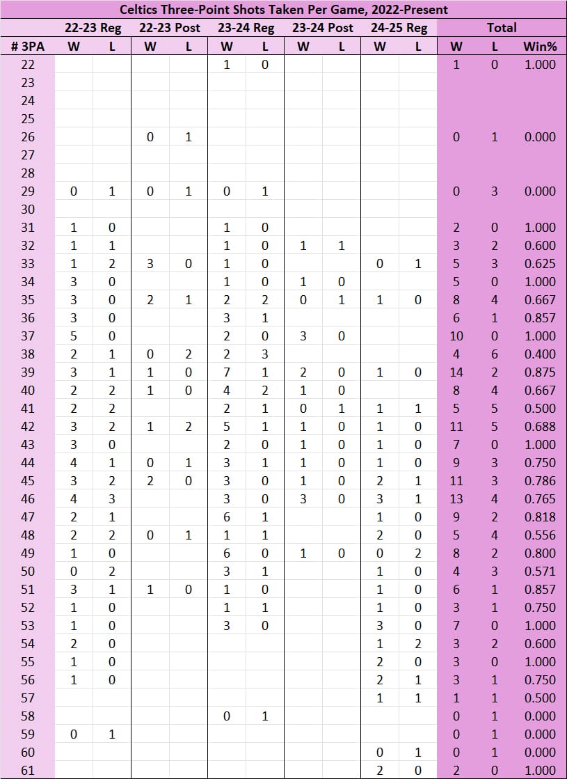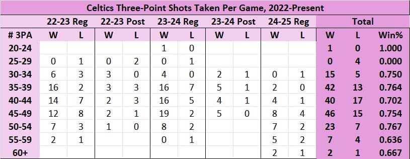 The third thing I take away is that the Celtics are just really good, and kind of malleable. A game with 35 three's taken is much different than one with 49 taken, but either way, the C's have won most of those games.