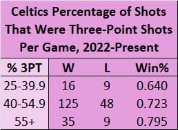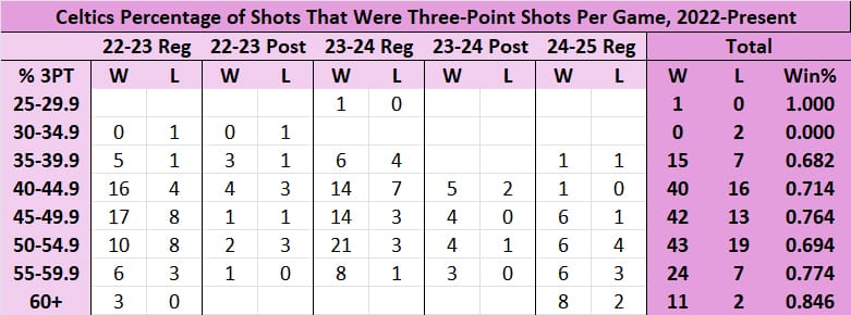 If these breakdowns look very similar, well that's because they are. In fact, they are a little more exacerbated. The C's have done even better when 55% or more of their shots are three pointers, and that has been true in all five of the season/postseason buckets. This season, they're getting to those percentages more often – after getting to 55+% 25 times from the 22-23 regular season to last postseason, they've already done so 19 times this season. And in those 19 games, they're 14-5, for a .736 winning percentage that equates to a 60-win season. That's not as good as the .795 winning percentage there as a whole, but either way, it's pretty great, and significantly better than when they take more two's.