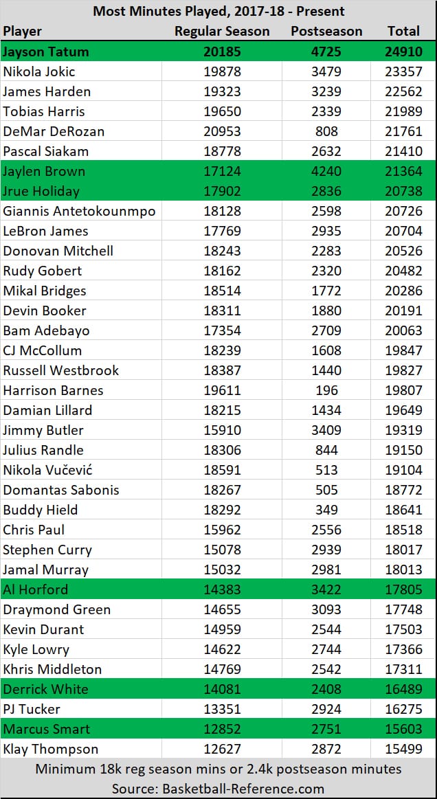 The 1,553 minute gap between Tatum and Jokić is roughly the same as the gap between Jokić and DeMar DeRozan in fifth place (1,596). Obviously, Jokić is still playing this postseason and will cut into that, but the point stands. We don't think about minutes played as much because games played is the shinier, easier-to-understand statistic, but since entering the league, Tatum has been the NBA's iron man.