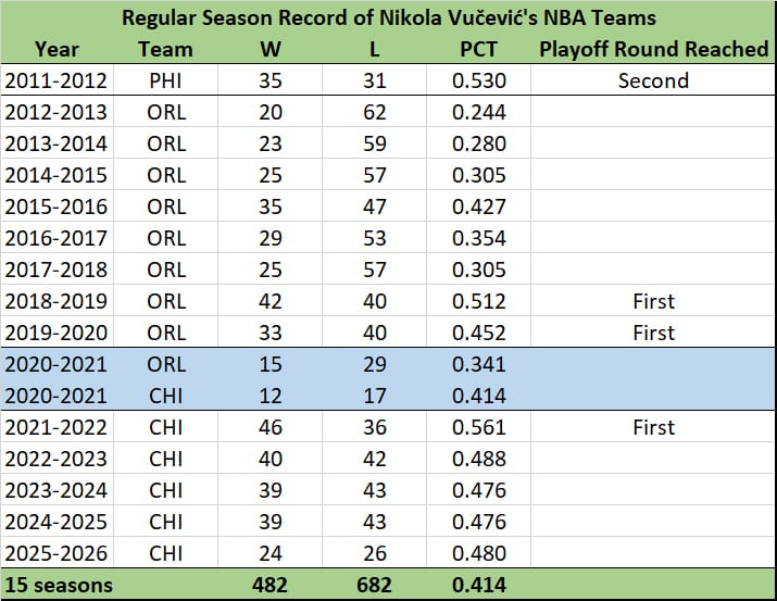 That season was technically a winning team, but it ended up being a massive disappointment, especially given the trajectory of the season. And the Bulls have been on the treadmill of mediocrity ever since. The crucial question of course is was Vucci Mane the reason (or one of the main reasons) that his teams have performed ... suboptimally ... or has he repeatedly been an innocent victim of circumstance. On the one hand, bigs are not shy about telling you that they can't pass themselves the ball, so they're more dependent on their teammates for offensive success.